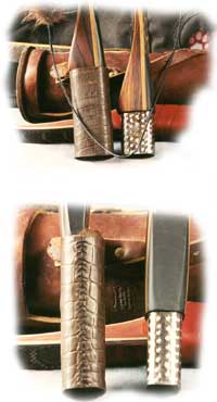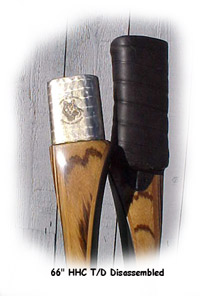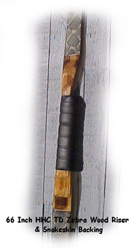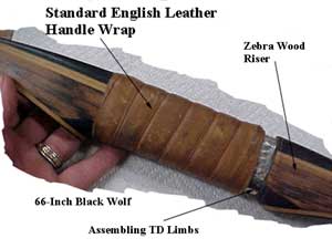 The HHC-TD is built on the same order of a BW or Lobo. The newer, redesigned 66-inch model has a top limb that is one-inch longer than the older models. Also, the bottom limb is one-inch shorter. The sight-window is only one-inch higher than the center of the bowstring. As a result the bow shoots very well with a greater variety of spined arrows, similar to the one-piece HHC. Despite the differences in limb length, the TD feature is still convenient, easy to pack and handy. Leather