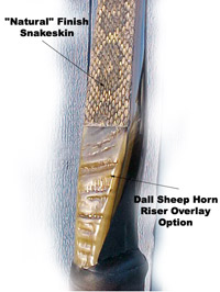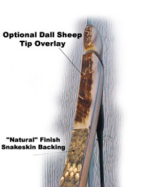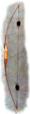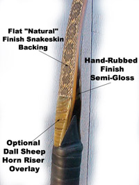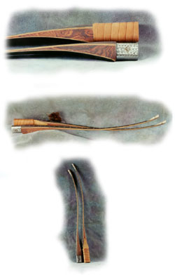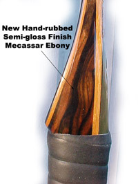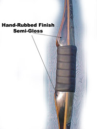Building any longbow with exotic hardwood gives the finished product a higher standard of quality and craftsmanship. It is the standard in the industry. I use only high-grade materials that are busy in color and figure. Raw stock is selected for me by my vendor and carefully graded. The riser sight-window is cut so the arrow rides 1/8 th inch off center. This seems to produce the best arrow performance. The shelf or rest is cut to form a radius from back to belly. The strike plate is cut to form a radius from back to belly. Both surfaces are covered with leather. Where the two radii meet the arrow makes contact with the bow. This geometry seems to produce the best arrow performance. By making sure to keep the leading edge of the fletching smooth on all arrows shot out of these bows the life of the arrow rest is unlimited. Proper waxing and oiling keeps the leather arrow rest and strike plate in good condition for the life of the bow. For years I have built my longbows with "equal limb length". In other words, the top and the bottom limbs were made with both limbs identical in length measured from the center of the riser. Today, I build the HHC, Lobo and Black Wolf with limb lengths that differ between the top and bottom limbs. The top limb is one-inch longer. The bottom limb is one-inch shorter. This effectively moves the riser one-inch lower in the finished bow, and puts the sight-window within one-inch of the center of the bowstring. The result of doing this produces a bow that casts a greater variety of spined arrows. For the average person just being introduced to a longbow, it makes it easier to select arrows that work well out of the bow. Also, with the shorter bottom limb, 66-inch bows become somewhat more convenient to handle in blind situations where the space is somewhat cramped, or shooting from kneeling positions. The limbs also have a change with respect to the three laminations that I am using in the HHC. Now all three lams are built on the back of the riser. Earlier models were built with the belly lam on the belly of the riser. This belly lam is now with the other two on the back of the riser. The FRP, carbon and glass are laminated to the belly of the riser only. In effect, the new design is stronger, more reliable, and esthetically more appealing with the limb length changes.